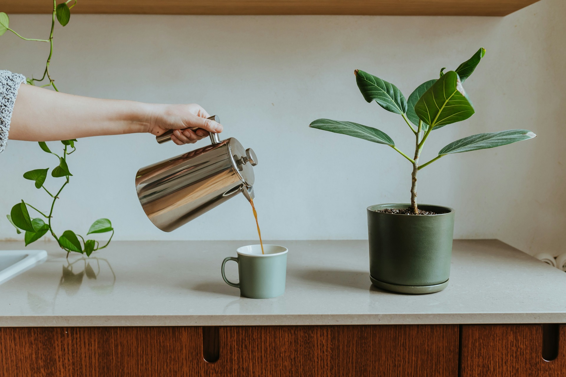 Zeleň funguje jako živý prvek kompozice. Vnáší do interiéru měkkost, strukturu a vizuální rovnováhu. Rostliny propojují prostor s přírodou a zároveň kultivují jeho atmosféru.